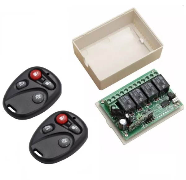 Kit receptor 4 canales + 2 controles remoto. 4 Salidas por Relay NC NO C. Diferentes opciones en las salidas a rele (monoestable, seguidor)
