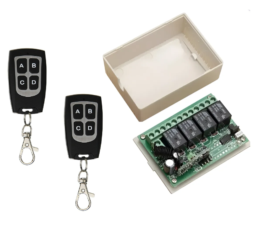 Kit receptor 4 canales + 2 controles remoto. 4 Salidas por Relay NC NO C. Diferentes opciones en las salidas a rele (monoestable, seguidor)